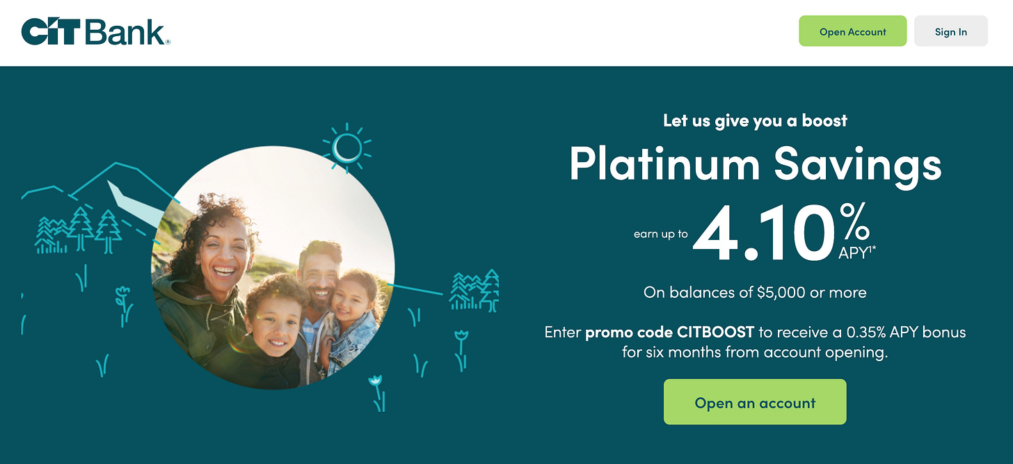 I wrote an article listing my favorite HYSAs back in 2023 here. CIT Savings remains our main HYSA with a 3.75% APY on balances of $5,000 or more (they are currently offering a six-month 0.35% boost for new customers for six months, bringing the APY to 4.10%).